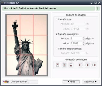 El cuarto paso es quizá el más relevante ya que definirá el tamaño final del póster. Consiste en decirle al programa cómo quieres que quede de grande y PosteRazor te entenderá de tres formas diferentes: si le dices el tamaño final deseado (por ejemplo 100 cm), si le indicas el tamaño en páginas o bien si le indicas el porcentaje de la foto (100% aprovechará la resolución de la imagen al completo).